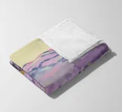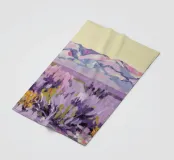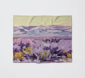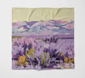 Colline ondulate ricoperte di una soffice e vaporosa lavanda si estendono verso una lontana e pallida catena montuosa. I colori delicati e la messa a fuoco morbida creano un paesaggio sognante, tranquillo e suggestivo.