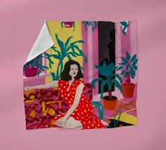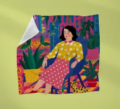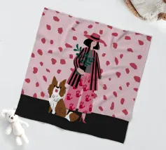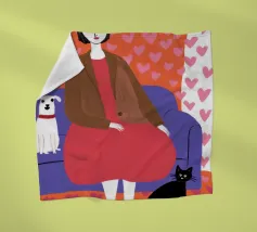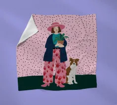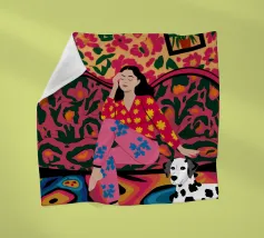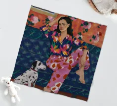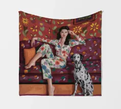 Una donna si trova in una cucina dai colori vivaci con un dalmata al suo fianco, una finestra che mostra una scena all'aperto e vari dettagli della cucina, creando un'illustrazione domestica eccentrica e affascinante.