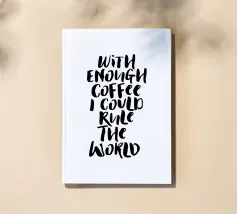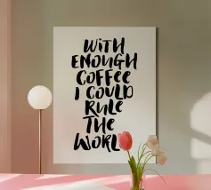 Questo affascinante design è caratterizzato da scritte nere disegnate a mano su un nitido sfondo bianco, che creano una dichiarazione visiva giocosa e divertente. È perfetto per gli appassionati di caffè, per gli ambiziosi e per chiunque apprezzi il senso dell'umorismo legato alla caffeina. La tipografia casual e artigianale sottolinea la natura spensierata del messaggio, aggiungendo un tocco personale. Lasciate che questo pezzo accattivante celebri il vostro amore per il caffè e le vostre aspirazioni di dominio del mondo, trasformando il vostro ambiente in un centro di produttività e risate.