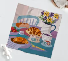 Una scena di colazione con pretzel, una bevanda e un cartone di latte è disposta su un tagliere verde, con una finestra e tende blu sullo sfondo, a rappresentare una semplice mattina di tutti i giorni.