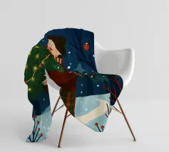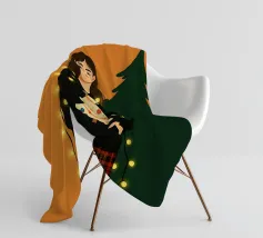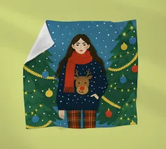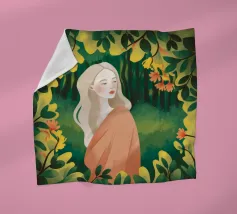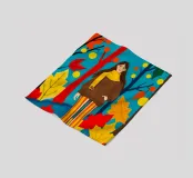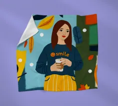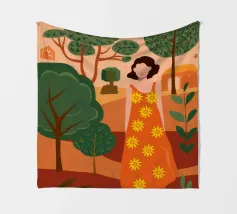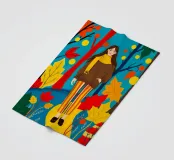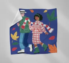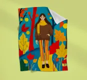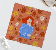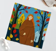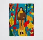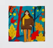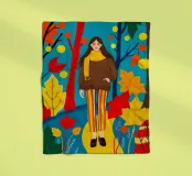 Una scena autunnale con una giovane donna che cammina lungo un sentiero che attraversa una colorata foresta autunnale. Lo sfondo è di un vivace azzurro cielo, che crea un contrasto deciso con le tonalità calde delle foglie e del fogliame autunnale. La donna indossa uno spesso maglione marrone, una sciarpa giallo senape avvolta attorno al collo e pantaloni a righe verticali arancioni, gialle e bianche che riprendono le tonalità autunnali circostanti.