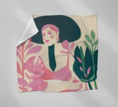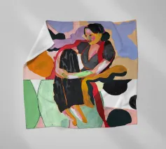 Un ritratto astratto di una donna il cui volto è oscurato da un grande cappello verde e da abiti colorati, che creano un'aura di mistero e intrigo elegante.