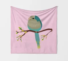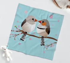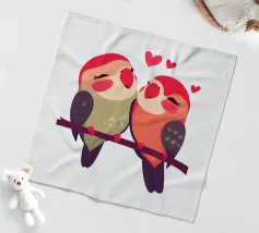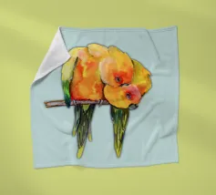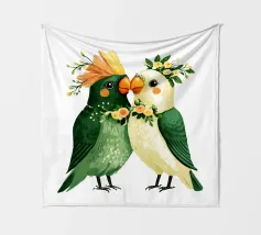 Un'immagine di due inseparabili della pesca appollaiati l'uno accanto all'altro. Elementi floreali aggiunti digitalmente. Sembrano molto rilassati e guardano l'osservatore.