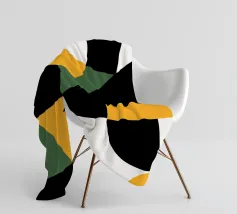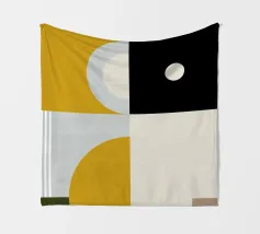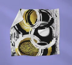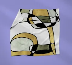 Forme astratte in nero, bianco e oro creano una composizione dinamica con curve fluide e angoli acuti. Il gioco di colori aggiunge profondità e movimento, suggerendo un senso di energia e contrasto.