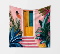 An illustration of a modern, blue and yellow building at night, surrounded by lush plants. The composition is cool, atmospheric, and has a stylish, contemporary, urban feel.