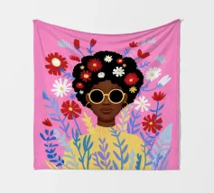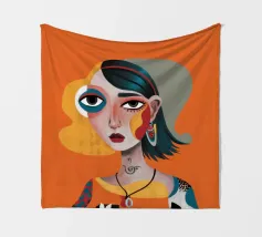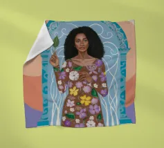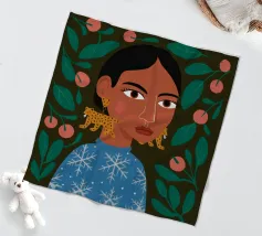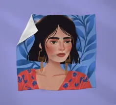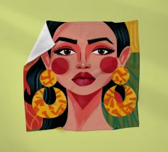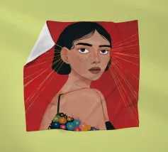 Questo dipinto raffigura una persona con i capelli neri che indossa un abito colorato con forme geometriche. Lo sfondo è rosso e la persona è adornata con grandi orecchini circolari.