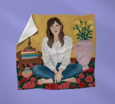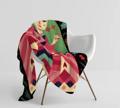 Questo dipinto raffigura una persona con i capelli neri che indossa un abito colorato con forme geometriche. Lo sfondo è rosso e la persona è adornata con grandi orecchini circolari.