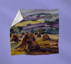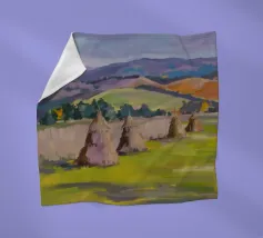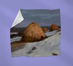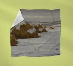 Un dipinto di paesaggio con un grande pagliaio in un campo vicino a un fiume o a uno specchio d'acqua tranquillo. Il cielo è di un grigio tenue e coperto, e la tavolozza generale è sobria con toni terrosi.