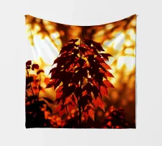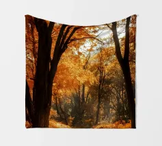 La luce dorata del sole filtra attraverso le vibranti foglie autunnali, creando un'atmosfera calda e serena in un ambiente naturale. I ricchi colori delle foglie esaltano la bellezza della scena.
