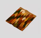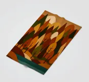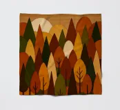 Una scena di foresta stilizzata e armoniosa con fiume, ricca di calde tonalità autunnali in un effetto legno con legni colorati. (Una miscela di forme geometriche e curve morbide per formare gli alberi, ciascuno con una combinazione unica di colori come l'arancione bruciato, il verde intenso, il giallo oro e il marrone terroso. Questi colori si fondono magnificamente, evocando la sensazione dell'autunno, quando la tavolozza della natura è al suo massimo splendore.