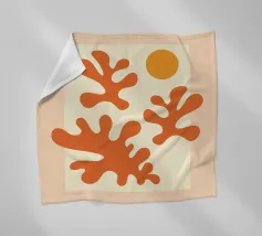 arte botanica astratta, forme moderne di piante, foglie di corallo rosa, illustrazione del sole arancione, sfondo blu pastello, design floreale minimalista, natura astratta contemporanea, grafica fogliare giocosa, opera d'arte dalle forme audaci, stampa ispirata a Matisse, atmosfera moderna tropicale, flora astratta vibrante