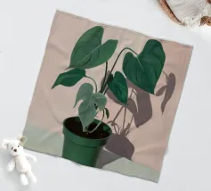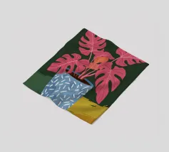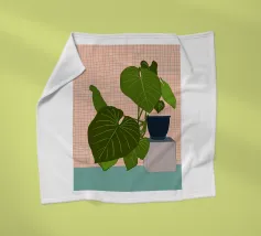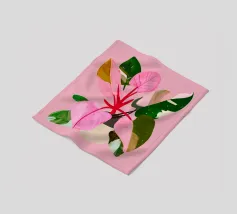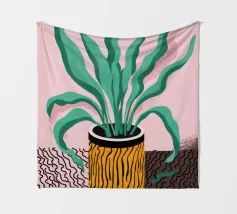 Una pianta di anthurium rosa di grande effetto si trova in un vaso variopinto e decorato su uno sfondo di un vibrante rosa caldo. La composizione è una celebrazione audace ed elegante del colore e delle piante tropicali.