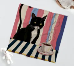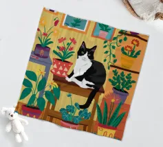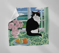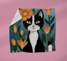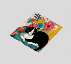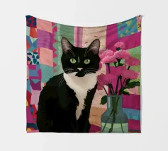 Un gatto bianco e nero siede regalmente dietro un grande vaso di fiori con motivi a strisce vivaci, sullo sfondo di una tenda rosa, creando una natura morta suggestiva e affascinante.