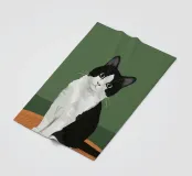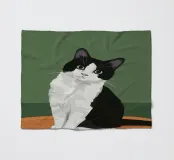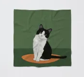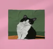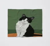 Un bel gatto tuxedo bianco e nero siede in una posizione composta ed elegante, guardando direttamente l'osservatore con un'espressione calma e gentile, catturata in un ritratto semplice e bello.