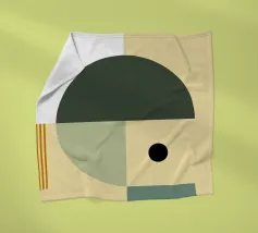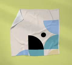 Forme geometriche in colori tenui sono disposte in una composizione equilibrata, con cerchi, quadrati, frecce e forme simili a foglie. Il disegno utilizza una tavolozza di toni blu, verdi, gialli e arancioni.