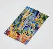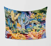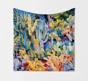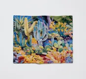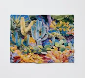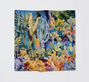 Un giardino nel deserto è rappresentato come un caleidoscopio di colori e forme, con vari cactus e piante grasse resi in forme vibranti e sovrapposte e una tavolozza di blu, gialli e verdi.