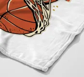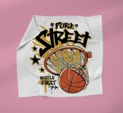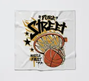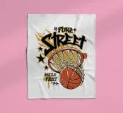 Design urbano del basket con tipografia graffiti, tavolozza arancione e nera e canestro in rete. Uno stile street distintivo per abbigliamento sportivo e casual.