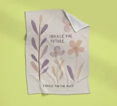 Un design minimalista che traduce la respirazione e la consapevolezza in forme e colori. Superfici delicatamente sovrapposte in verde tenue, rosa e nero formano uno sfondo calmo e organico. Le parole INHALE (orizzontale in alto a sinistra) ed EXHALE (verticale a destra) sono scritte in lettere maiuscole bianche e chiare: ridotte ma efficaci.
