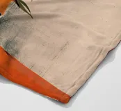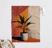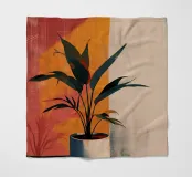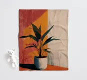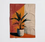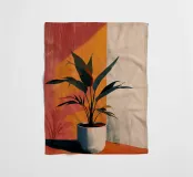 Un vibrante dipinto a olio raffigurante una pianta tropicale in vaso, ricco di toni caldi e contrasti decisi. I rossi profondi, gli arancioni e le tonalità dorate evocano calore e vitalità, mentre le pennellate strutturate aggiungono profondità e drammaticità a questa composizione lussureggiante in un interno vintage e all'avanguardia.