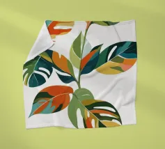 Questa vibrante opera d'arte presenta una composizione dinamica di foglie tropicali in colori audaci e contrastanti. L'opera presenta un mix di fogliame verde intenso, rosa tenue e arancione brillante, con intricati motivi di venature che aggiungono consistenza e dettagli. Il gioco di toni caldi e freddi crea un'atmosfera vivace ed energica, mentre lo sfondo pulito color crema permette alle foglie di risaltare in modo evidente. L'approccio grafico e stilizzato conferisce all'opera un'estetica moderna e giocosa, evocando la bellezza lussureggiante della natura in un design contemporaneo.