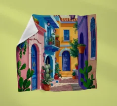 Un'illustrazione vibrante e dettagliata di una città collinare simile a un labirinto, con case colorate, scale e piante ovunque. La scena è una rappresentazione gioiosa, energica e complessa di una vivace comunità mediterranea.