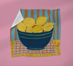Una moderna natura morta di tre limoni in una scatola, su uno sfondo di foglie verdi e motivi grafici in bianco e nero. La composizione è un mix sorprendente di forme naturali e design grafico.
