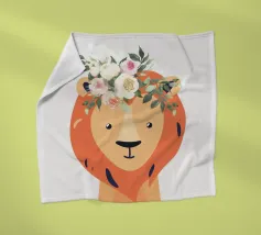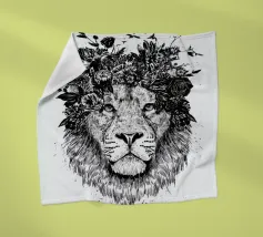 Il ritratto di un leone mostra grandi occhi espressivi e una corona floreale in bianco e nero. La morbida pelliccia è perfettamente enfatizzata in un'illustrazione fotografica minimalista e cattura lo straordinario fascino della natura. Ideale per gli amanti degli animali.