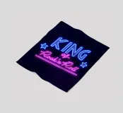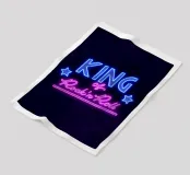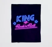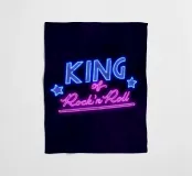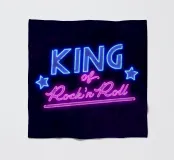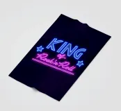 Una bella scritta a mano che sembra un'insegna al neon. Re del Rock'n Roll. Per tutti coloro che amano il rock'n roll e questo stile di vita, questa attitudine alla vita. Un grande motivo di hand lettering in colori vivaci come il blu e il rosa.
