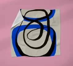 Una spessa linea blu serpeggia su uno sfondo neutro, creando un motivo astratto dalle forme audaci e curvilinee. La semplicità del disegno enfatizza il movimento e il flusso della linea continua.