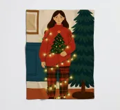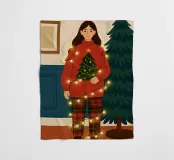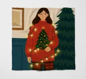 Donna a casa che decora il suo albero di Natale. Le luci natalizie sono aggrovigliate intorno al suo corpo.