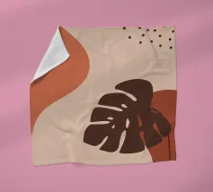 L'immagine presenta un'illustrazione astratta con una grande foglia di monstera nera e il contorno di una mano. Lo sfondo è costituito da forme morbide e fluide nei toni del beige e del marrone, che creano un'atmosfera armoniosa e organica.