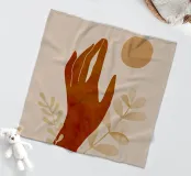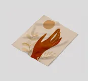 Illustrazione minimalista dai toni caldi della terra. Una mano stilizzata si protende verso il sole, mentre le foglie morbide sullo sfondo aggiungono un senso di equilibrio e natura. L'opera d'arte trasmette semplicità, serenità e una tranquilla connessione con il mondo naturale.