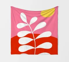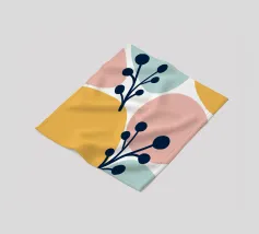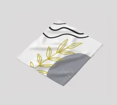 Un disegno botanico minimalista presenta un ramo bianco delineato con foglie. Linee curve e forme organiche nei toni del blu, del verde e del giallo creano uno sfondo moderno e astratto.