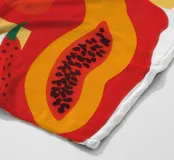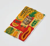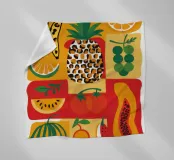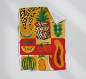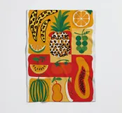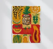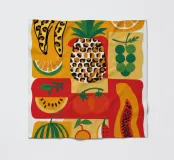 Una composizione vivace e generosa di vari frutti tropicali stilizzati come ananas, papaya e anguria. L'opera d'arte è una celebrazione colorata e gioiosa delle dolci offerte esotiche della natura.