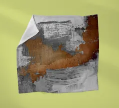 Moderna opera d'arte astratta con forme, linee e texture nei caldi toni della terra: marrone, ruggine, grigio e beige.