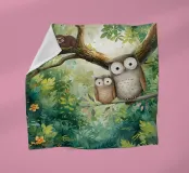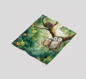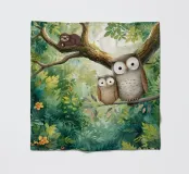 Un'affascinante scena di una mamma gufo che coccola il suo piccolo in una vivace giungla tropicale. Questo dolce disegno faunistico dona calore e un delicato tocco di natura a qualsiasi ambiente.