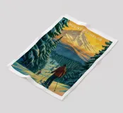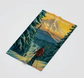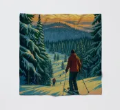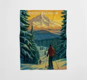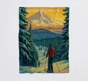 Uno sciatore si ferma al limite degli alberi, guardando il Monte Bachelor immerso nella luce dorata del tramonto. Sempreverdi innevati incorniciano la maestosa vetta, mentre ombre morbide si allungano sulle piste piene di polvere. Quest'opera d'arte cattura la tranquilla audacia del terreno alpino, un momento di silenzioso stupore nella luce alpina della natura.