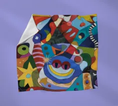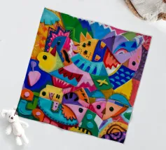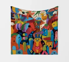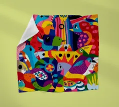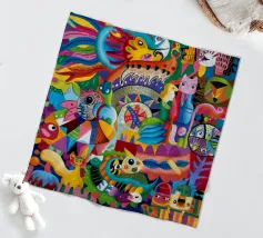 Un paesaggio surreale pieno di figure astratte, animali e forme geometriche. L'uso dinamico di colori vivaci e disegni intricati evoca immaginazione e curiosità.