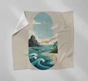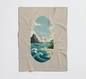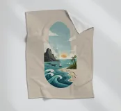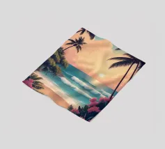 Una serena illustrazione minimalista di design piatto che cattura una vibrante scena oceanica al tramonto. Presenta onde ondeggianti, una spiaggia sabbiosa con impronte di piedi, palme, barche a vela lontane, maestose balene e aspre montagne costiere sotto un cielo parzialmente nuvoloso. L'opera d'arte utilizza una tavolozza rinfrescante di blu, verdi e toni caldi del tramonto per evocare tranquillità e avventura. Oceano, Mare, Spiaggia, Tramonto, Onde, Palme, Barche a vela, Balene, Costa, Montagne, Minimalista, Flat Design, Illustrazione, Tranquillità, Avventura, Digital Art