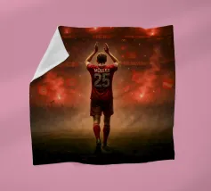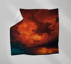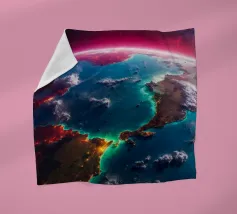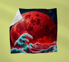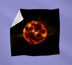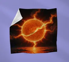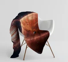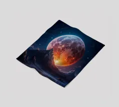 L'immagine ritrae una vista ravvicinata di Marte, che mostra la sua caratteristica superficie rosso-arancio. Un'importante fessura attraversa il pianeta, emettendo un bagliore ardente che suggerisce un'attività vulcanica. Il pianeta è immerso in un cielo scuro e stellato, con una debole nebulosa blu e rossa visibile sullo sfondo.
