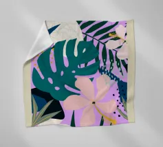Una lussureggiante scena di giungla incornicia un grappolo d'uva viola, creando una natura morta unica e inaspettata che fonde il fogliame tropicale con la frutta del frutteto in una composizione vibrante.