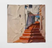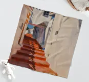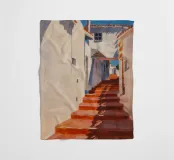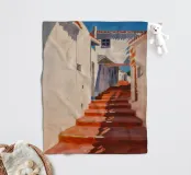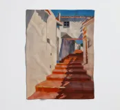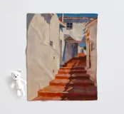 Uno stretto passaggio illuminato dal sole tra edifici bianchi è caratterizzato da una serie di scale rosso cremisi che creano una composizione audace, grafica e architettonicamente interessante, ricca di fascino mediterraneo.