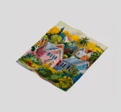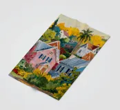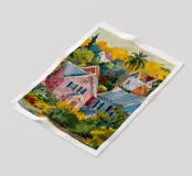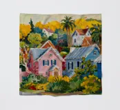 Un villaggio di case colorate di rosa, blu e giallo è adagiato sul fianco di una collina; la scena è composta come un'allegra trapunta patchwork di colori e forme, che emana un senso di comunità e gioia.