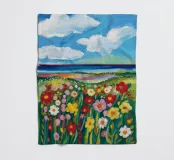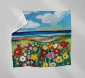 Un paesaggio impressionistico cattura un prato mozzafiato di fiori selvatici colorati che sbocciano su una scogliera che si affaccia su un mare azzurro e sereno sotto un cielo estivo, creando una scena di pura bellezza naturale.