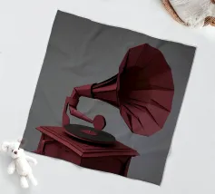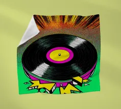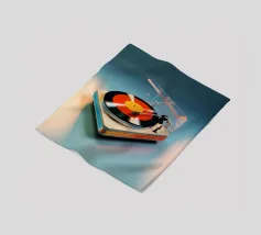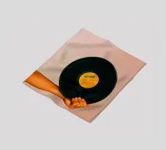 Questa immagine mostra un giradischi in stile vintage dal design chiaro e minimalista. Il giradischi è prevalentemente color pesca con una finitura opaca e un disco verde chiaro sul piatto. Il braccio, che si trova sul lato destro, è anch'esso color pesca con accenti beige e un cavo nero che lo affianca. Lo sfondo è di un colore neutro bianco sporco che si integra con i toni pastello del giradischi. L'estetica complessiva è moderna, con un tocco retrò.