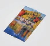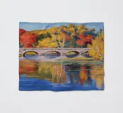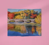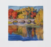Un ponte di pietra attraversa un fiume ampio e calmo che riflette perfettamente i brillanti colori autunnali degli alberi sulle sue rive: rosso fuoco, arancione e giallo sotto un cielo azzurro tenue.