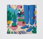 Un'illustrazione di una stanza vivace e in stile bohémien è assolutamente piena di una collezione di piante in vaso e cactus su un tappeto a righe colorate, creando un rifugio perfetto per un amante delle piante.