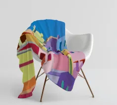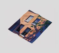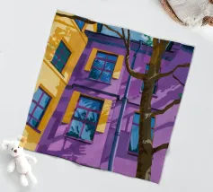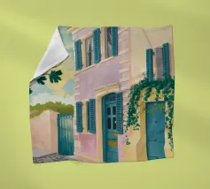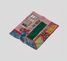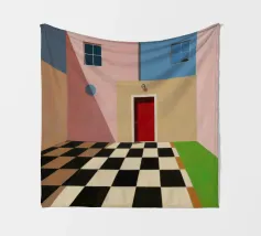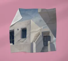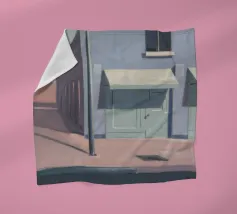 Una complessa scena urbana è resa con un'attenzione particolare alle forme geometriche e a un'audace tavolozza di colori rosa, verde acqua e rosso. Una scala esterna fornisce un forte elemento compositivo, guidando l'occhio attraverso le forme architettoniche astratte.