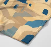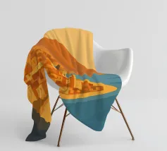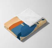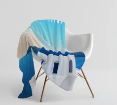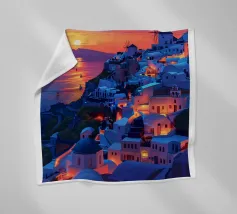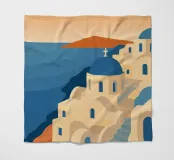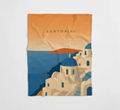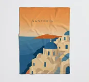 Design di viaggio minimalista della Grecia con le famose case bianche dell'isola greca di Santorini, le rocce vulcaniche e il blu del Mar Mediterraneo. Tipiche case graziose come nei villaggi di Oia e Fira.