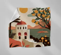 Una scena pittoresca di Santorini è caratterizzata da iconici edifici bianchi con cupole blu e una porta blu vibrante, che si affaccia sul mare scintillante sotto un cielo limpido con uccelli, incarnando il fascino idilliaco dell'isola greca.
